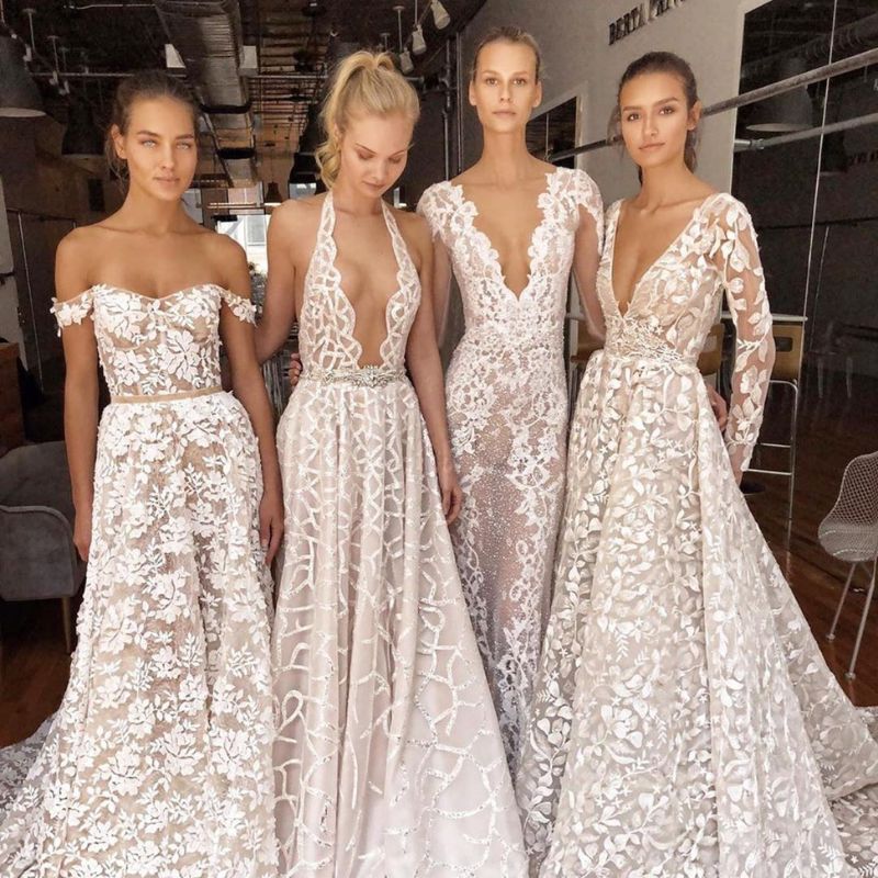 Intricate lace gowns with deep necklines and sheer details. Ideal for formal evening weddings in elegant indoor venues.