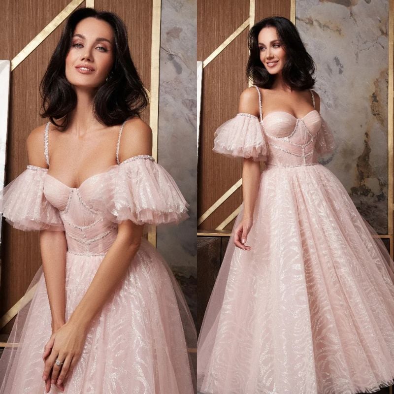 Soft dusty rose tulle with off-shoulder sleeves and a structured bodice. Ideal for elegant garden weddings or romantic evening receptions.