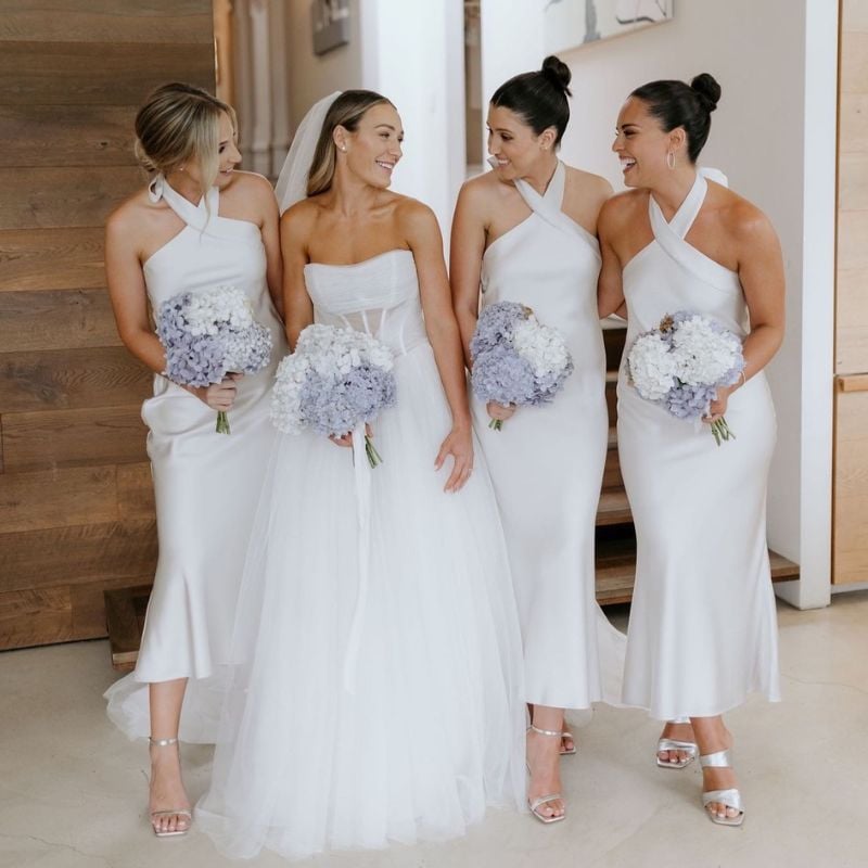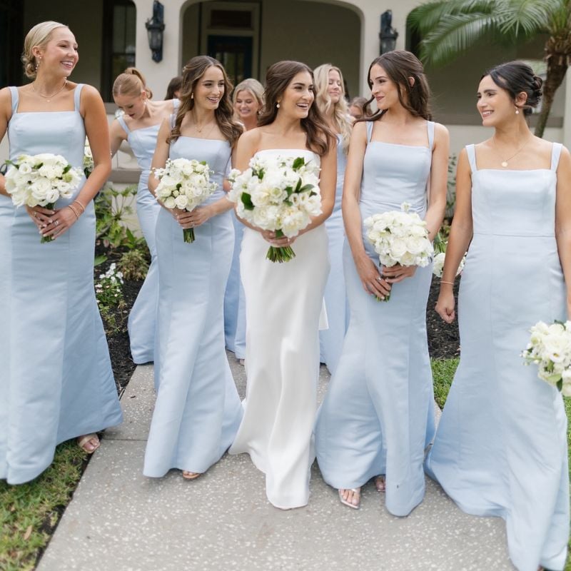 Minimalist powder blue dresses with square necklines. Ideal for daytime garden weddings or spring ceremonies.