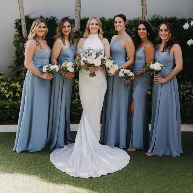 Coordinated steel-blue dresses in varying necklines. Ideal for cohesive yet modern bridal parties in outdoor venues.