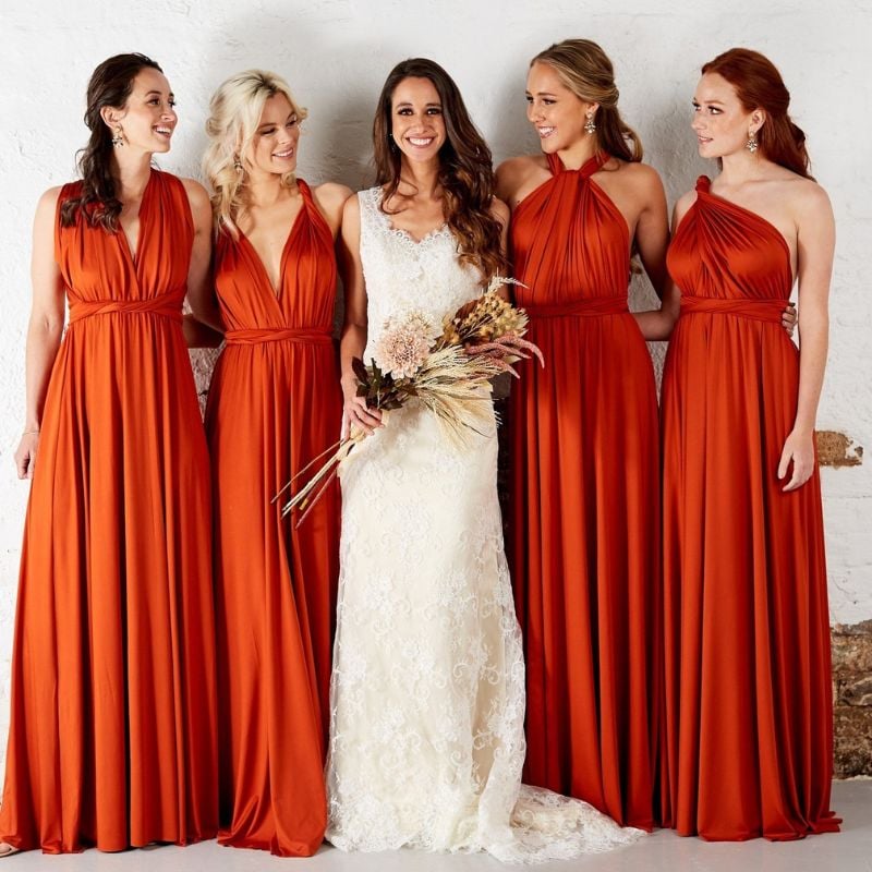 Flowing halter dresses in a rich rust tone. Beautiful for fall garden weddings or rustic outdoor ceremonies.