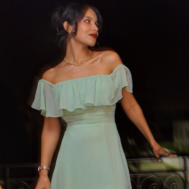 Light mint off-shoulder chiffon with romantic ruffle detail. Ideal for spring garden ceremonies or outdoor receptions.