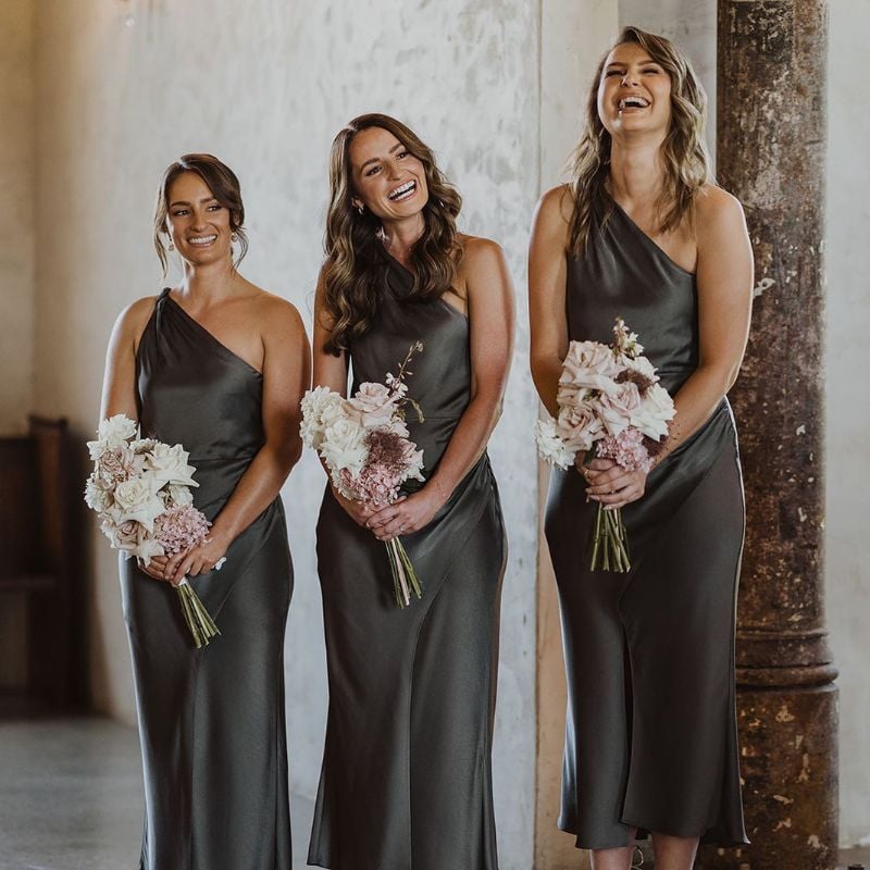 Sleek olive satin one-shoulder gowns with a modern drape. Best for indoor evening weddings or industrial-style venues.