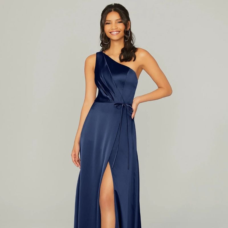 Deep navy satin with a wrap silhouette and high slit. Perfect for black-tie night weddings in ballrooms.