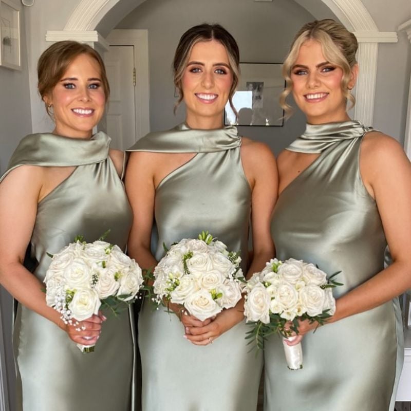 High-neck satin gowns in muted sage green. Elegant for upscale evening receptions in closed venues.