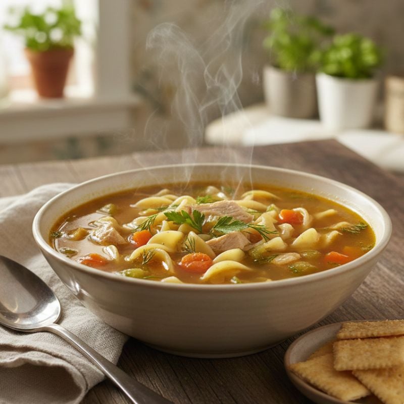 This is comfort food at its most practical. Chicken thighs stay juicy and cost less than breasts, while noodles help turn a simple broth into a filling, warming meal that works just as well for dinner as it does for leftovers.
