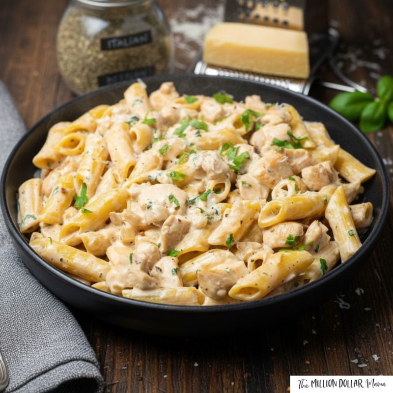 - Ingredients: Pasta, chicken, milk or cream, garlic
