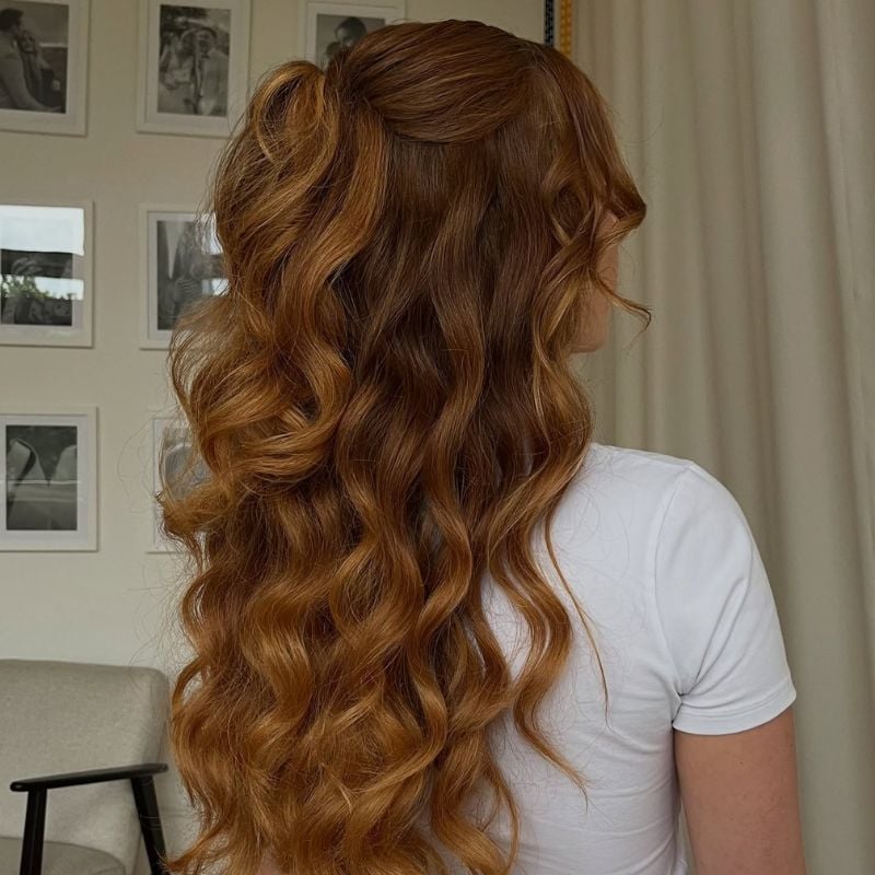 A voluminous crown puff transitions into cascading curls in this dreamy half-up look. A stunning option for weddings, dates, or formal dinners.