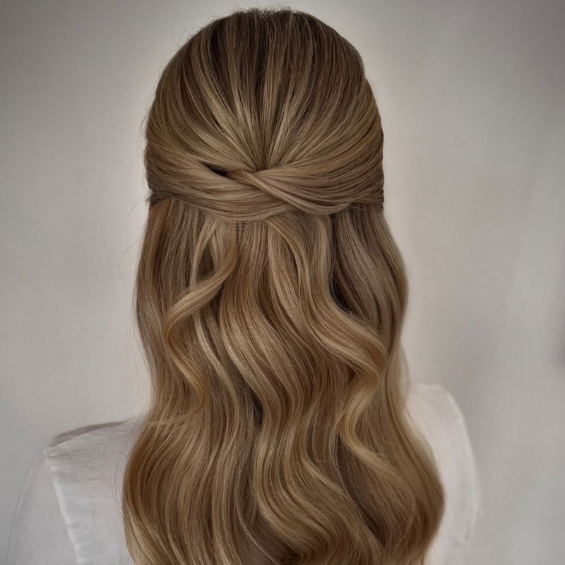 Two twisted side pieces are tucked and pinned at the back, blending into golden beachy waves. A timeless half-up style that works from morning to night.
