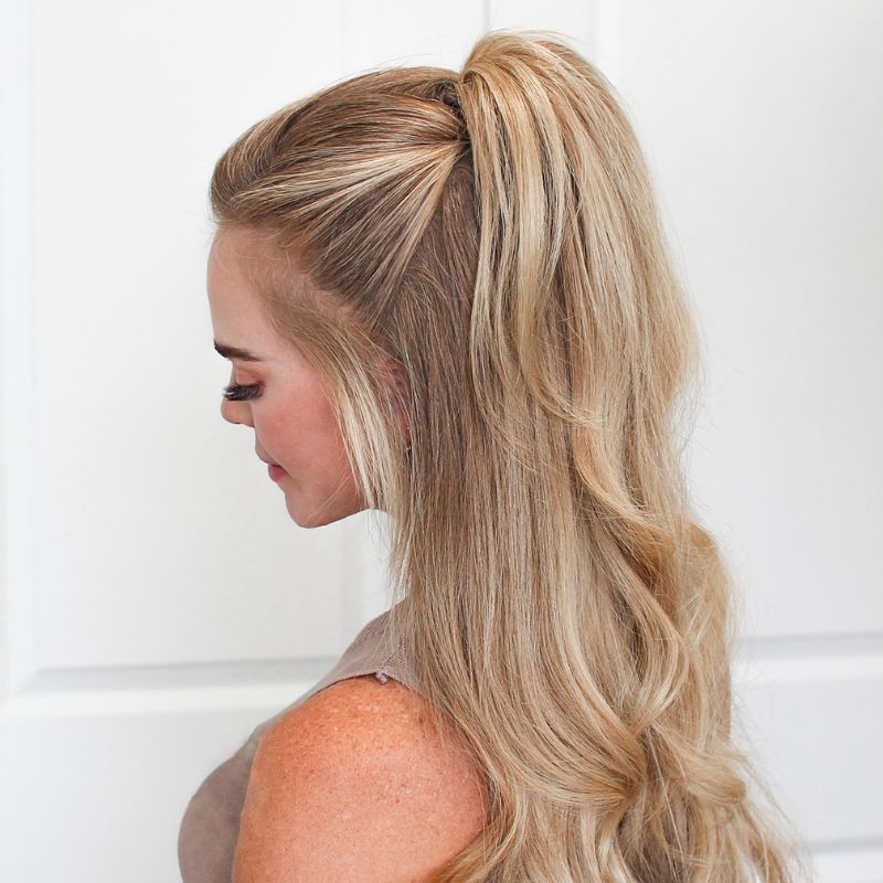 This look features a polished half-up ponytail with smooth, voluminous waves cascading down the back. The top section is gently teased for lift and pulled into a ponytail high on the crown, giving it a playful yet sophisticated feel.