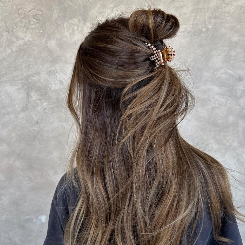 Loose strands and a half-up bun secured with a checkered claw clip create a laid-back, stylish vibe. Great for second-day hair or quick errands with flair.