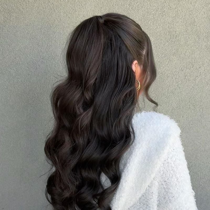 Long, dark waves are swept into a high half-ponytail, offering height and bounce. This look frames the face beautifully and elongates the silhouette.