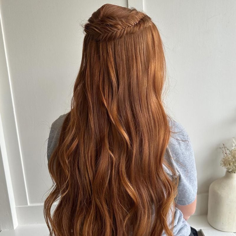 A fishtail braid wraps across the crown, bringing texture and shape to flowing auburn locks. A boho-inspired pick for festivals or outdoor events.