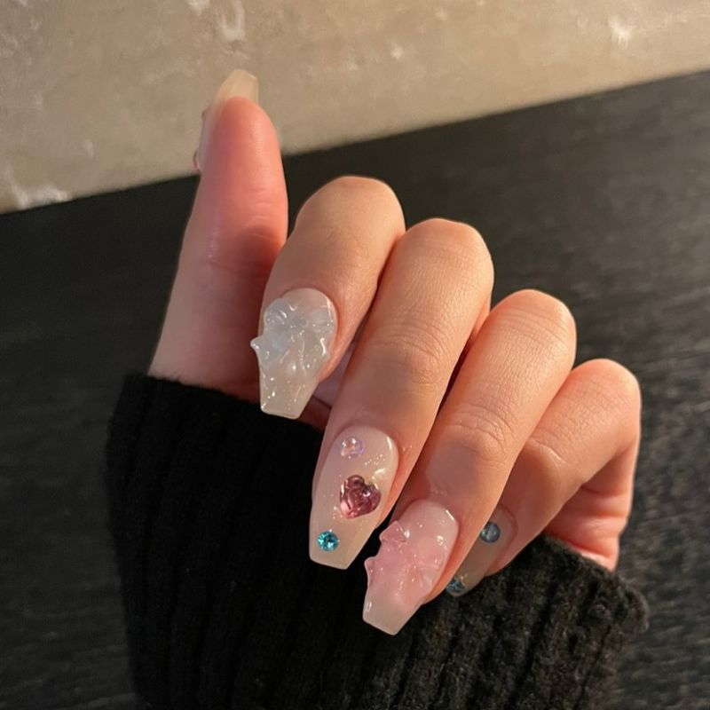 A soft translucent blush base with hand-painted brown ribbon accents and tiny minimalist charms. Sweet, thoughtful, and delicate, like a love note written on your nails.