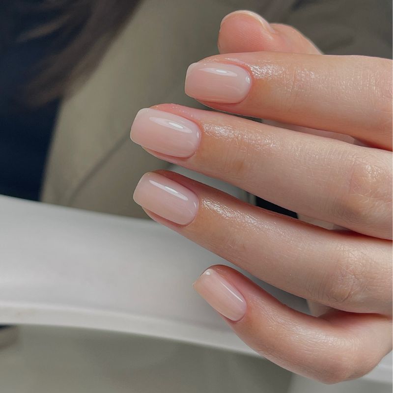 A soft, natural pink gel polish applied with a flawless, glass-like top coat.