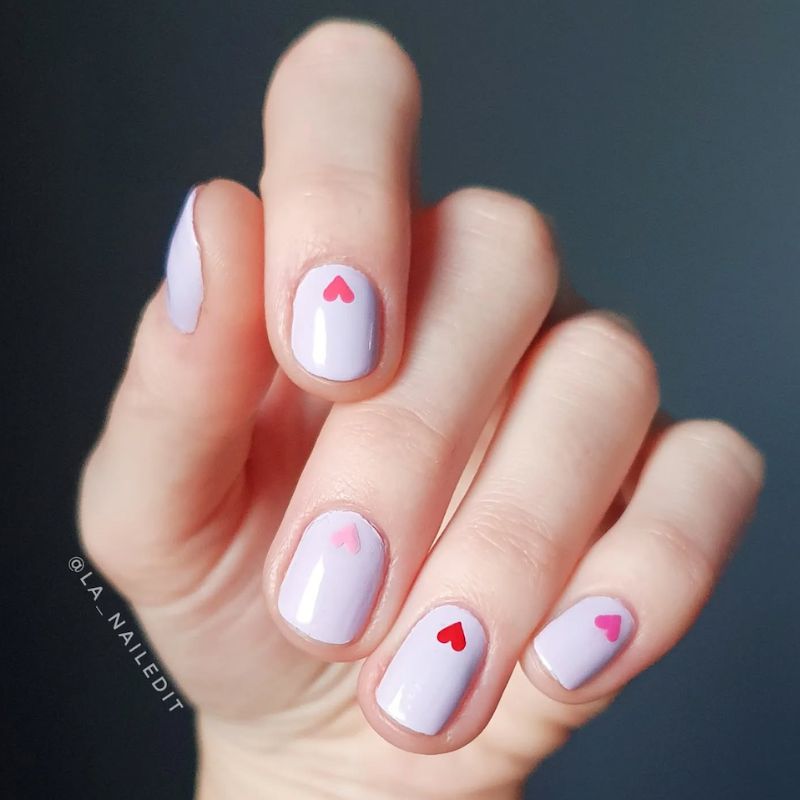 A light lavender pastel base with tiny hand-painted red and pink hearts placed on a few nails.