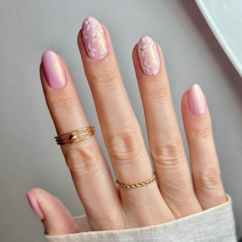 A skittle-style manicure in rose quartz pink, milky sheers, and tiny minimalist floral art.