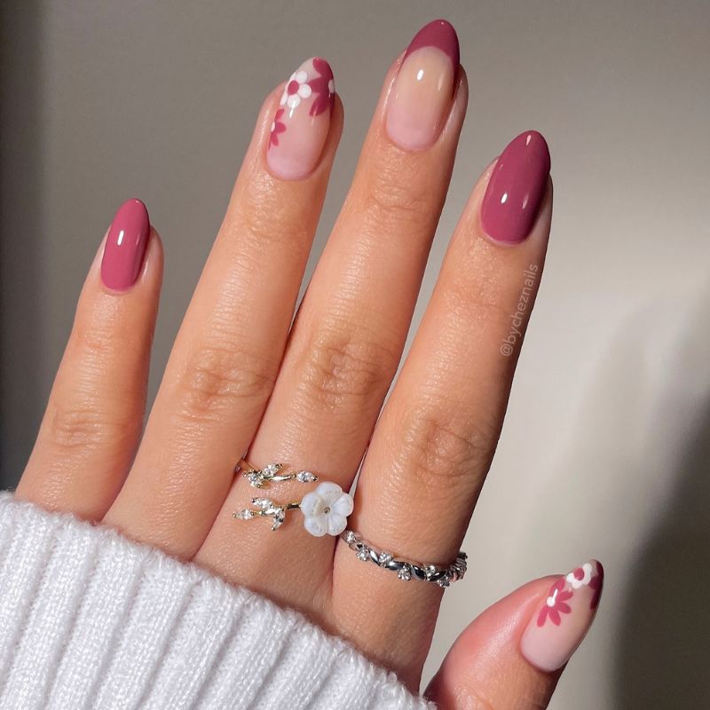 A warm rose-mocha gel color mixed with soft floral art on accent nails, finished with a glossy top coat.