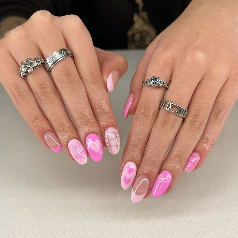A vibrant fuchsia gel manicure with playful pink hearts, clean ribbon art, and glossy depth on long almond nails.
