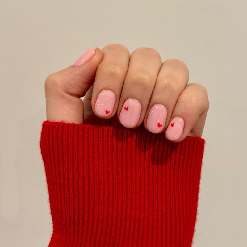 A soft, sheer pink base with tiny red heart details and minimalist drip accents near the tips.