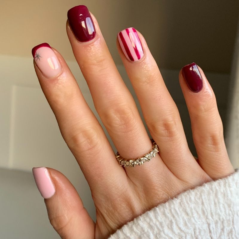 Deep mocha gel nails mixed with soft candy-inspired pink-red stripes on accent fingers, finished on a natural almond shape.