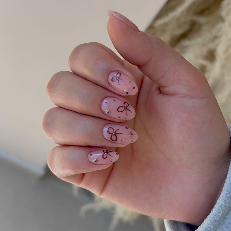 Satin red nails paired with milky pink and white bases, topped with bold burgundy dots and tiny ribbon accents.