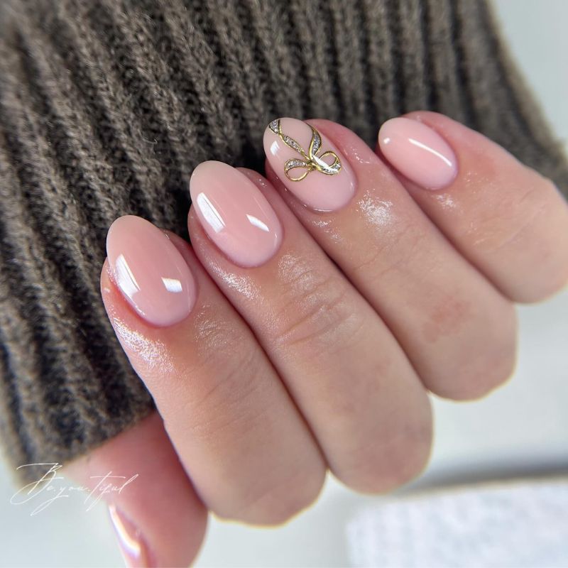 Glossy blush-pink nails with a sculpted gold ribbon detail on one accent nail. Warm, elegant, and minimal, with just enough charm to feel intentional and romantic for February.