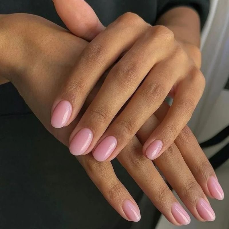A soft blush-pink base with clean, natural almond shaping and a glossy, barely-there finish.