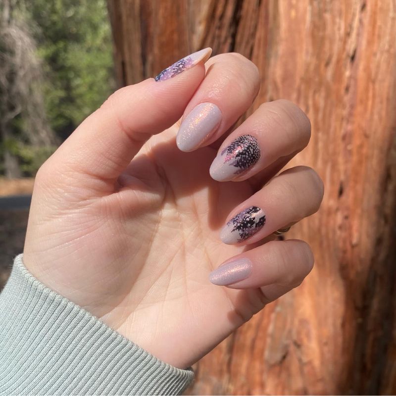 A soft lavender base with a smoky gradient, gentle chrome shimmer, and a floral February mood.