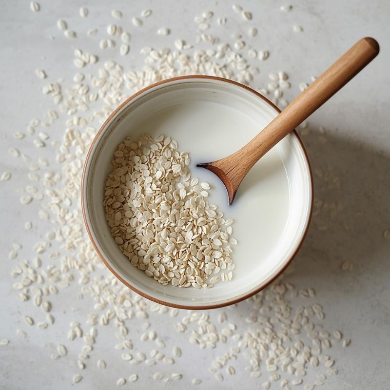 Oatmeal exfoliates mechanically and soothes skin inflammation. Milk contains lactic acid, which gently lightens discoloration.