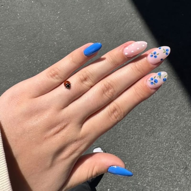 This March, Nail Design blends powder-blue nails with white polka dots and micro-floral accents in a soft blue hue on select nails.