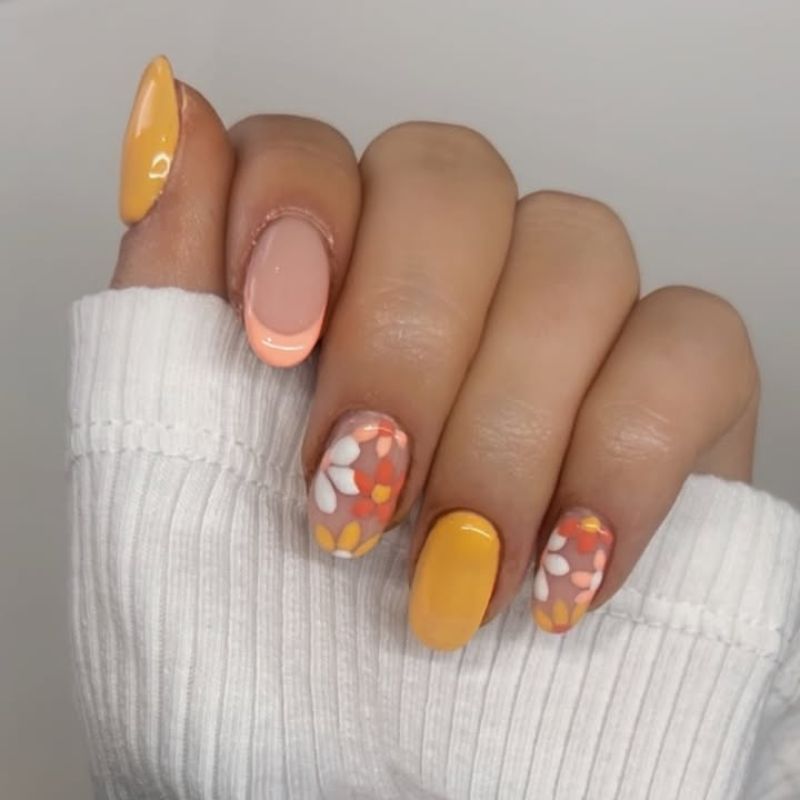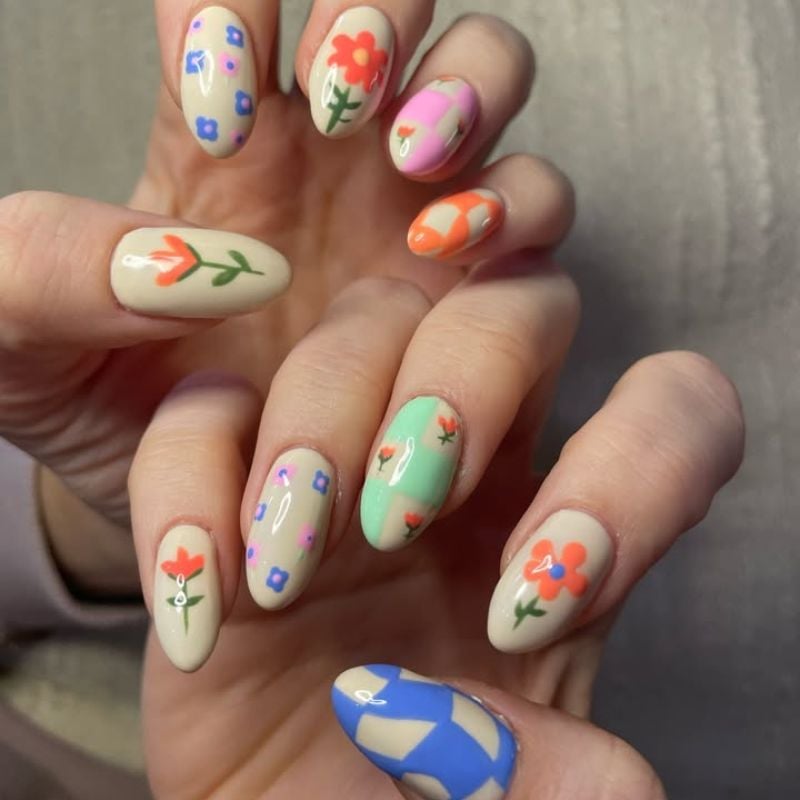 Soft pastel florals in orange, lavender, and pink on a milky nude and mint base, finished with one bold blue accent nail for balance. The flowers are flat and freehand-painted under gel, keeping the surface smooth and sealed for longevity.