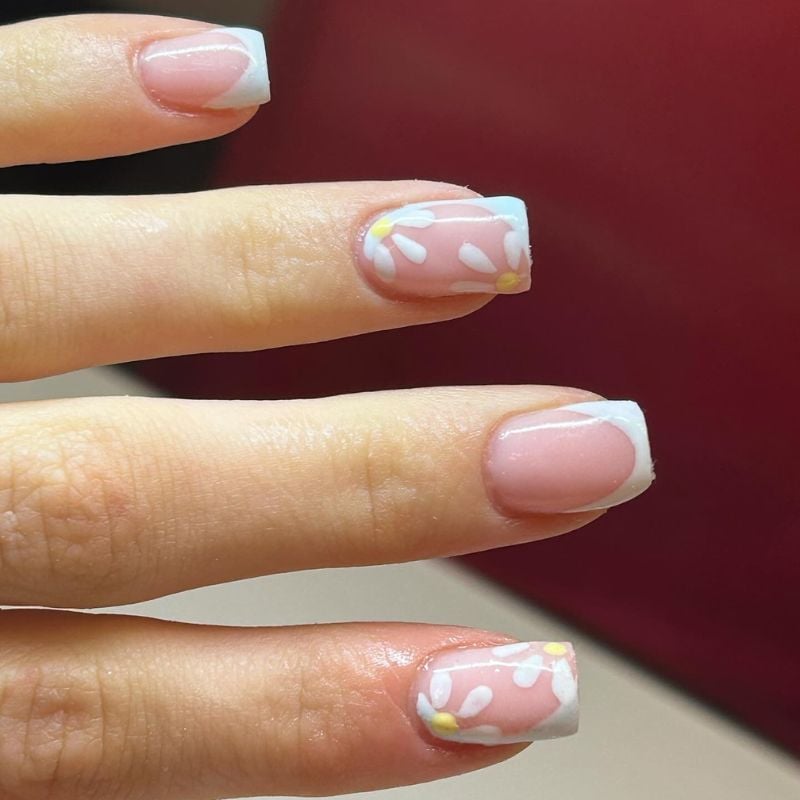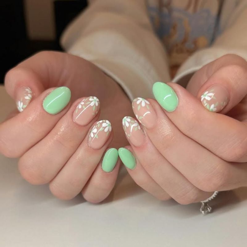 Milky mint green and soft nude pink, balanced with tiny white daisies placed on accent nails only.