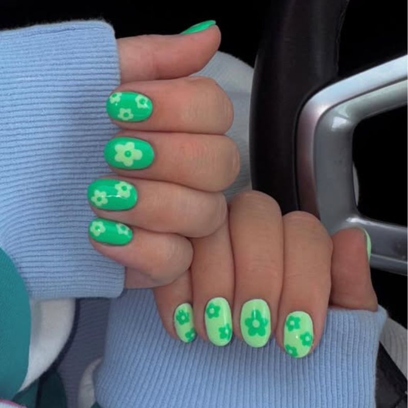 A pastel green fading into soft yellow using a sponge or soft gel brush for a gentle gradient. Mini floral details are added sparingly on selected nails to keep it clean and wearable.