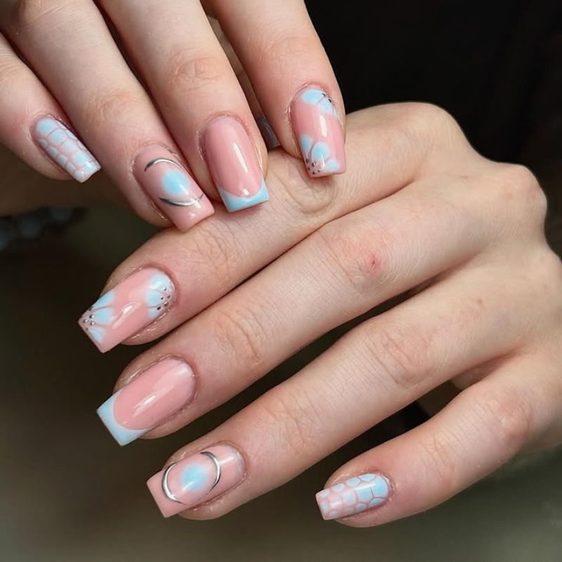 15. Blush Pink Gel with Soft Blue French and Minimal Line Details