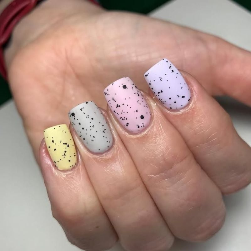 A mix of soft pastel gel shades (lavender, butter yellow, and milky pink) finished with delicate black speckles for a modern, artsy texture.
