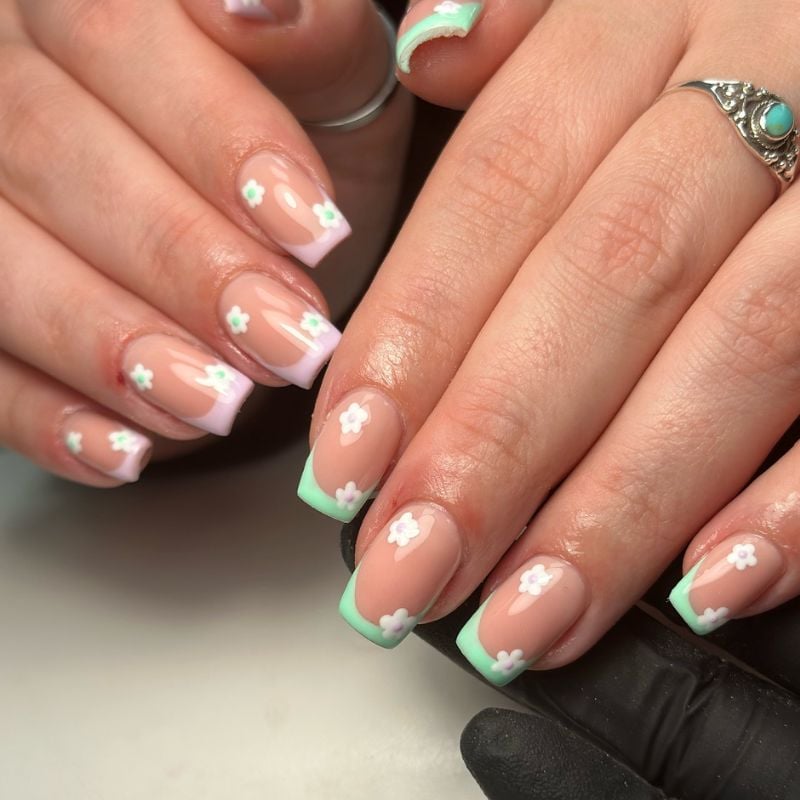 A sheer nude gel base paired with soft mint-green French tips on selected nails only, accented with tiny white flowers placed sparingly along the edges.