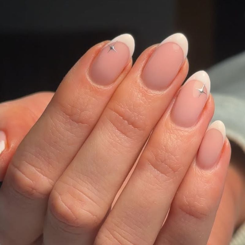 Keeps it minimal and chic with a sheer nude gel base on almond-shaped nails, elevated by a tiny starburst gem accent for subtle sparkle.