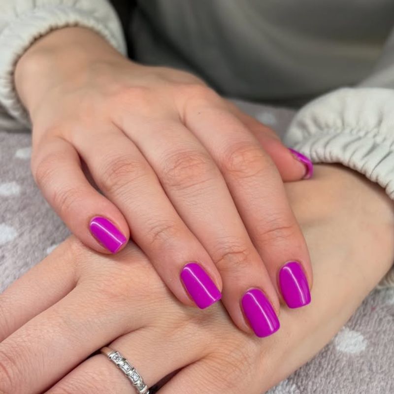 A bold, vibrant fuchsia pink gel polish sealed with a high-gloss top coat that reflects light dramatically.