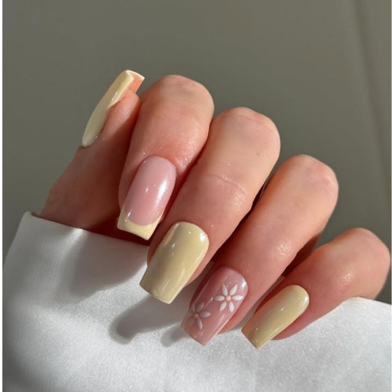 Glossy square nails in a creamy pastel yellow, paired with a nude French accent and one clear daisy nail. The look is soft, light, and perfect for early spring.