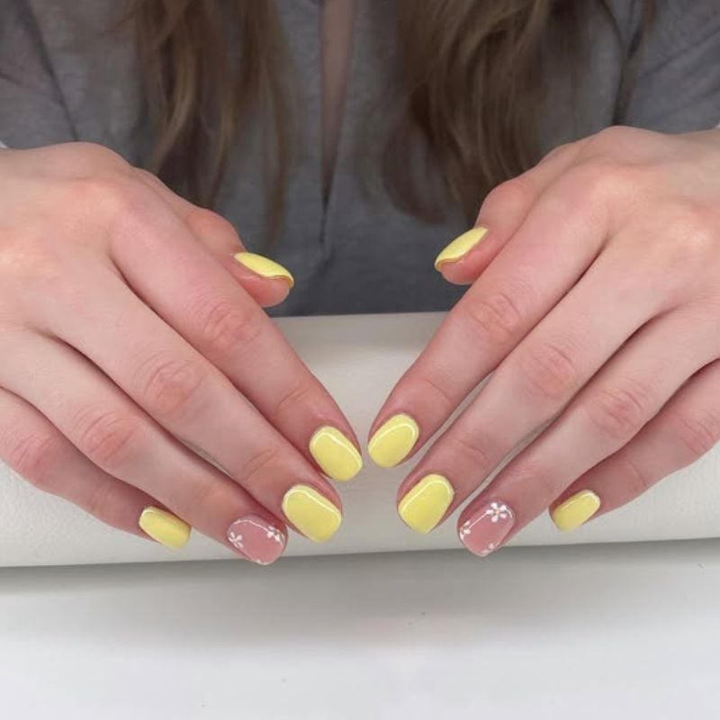 Short, round nails painted in bright pastel yellow, with nude ring fingers decorated with tiny white daisies. Fresh, cheerful, and super wearable for everyday.