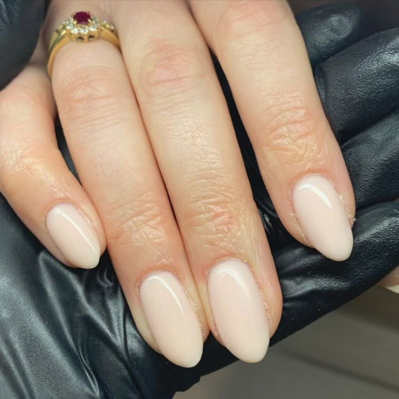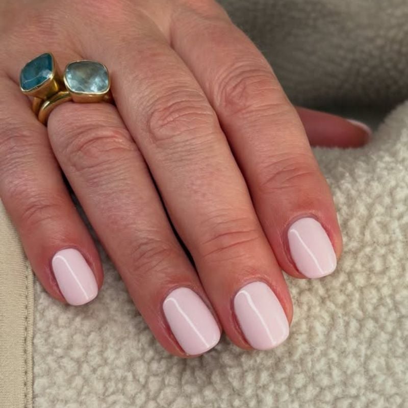 Milky blush-nude gel base and a high-shine, almost “wet glass” top coat.