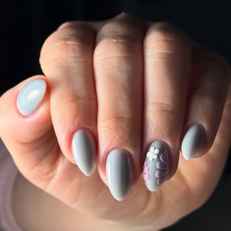 Smooth grey almond nails with one accent nail featuring pastel pink and lilac flower petals and a white center. A calm, neutral base with a subtle spring twist.