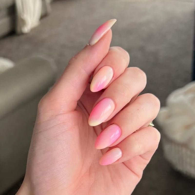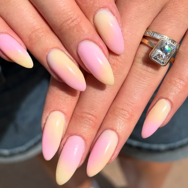 Long almond nails with a seamless gradient from pastel pink to soft yellow on each nail. The blend looks like a sunset and gives a dreamy spring vibe.