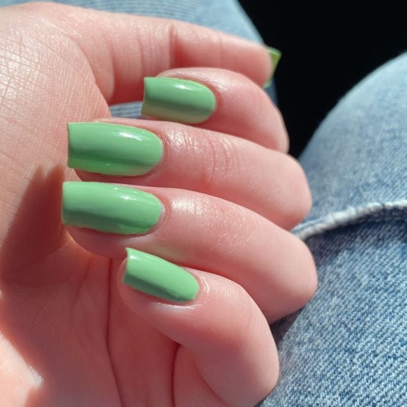 Creamy mint green gel polish with a high-gloss, ultra-reflective top coat. The shade is soft, clean, and fresh, making the hands look brighter and season-ready.