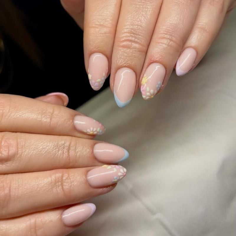 Milky nude gel base topped with delicate micro-floral nail art near the tips and a thin powder-blue French line on select nails.