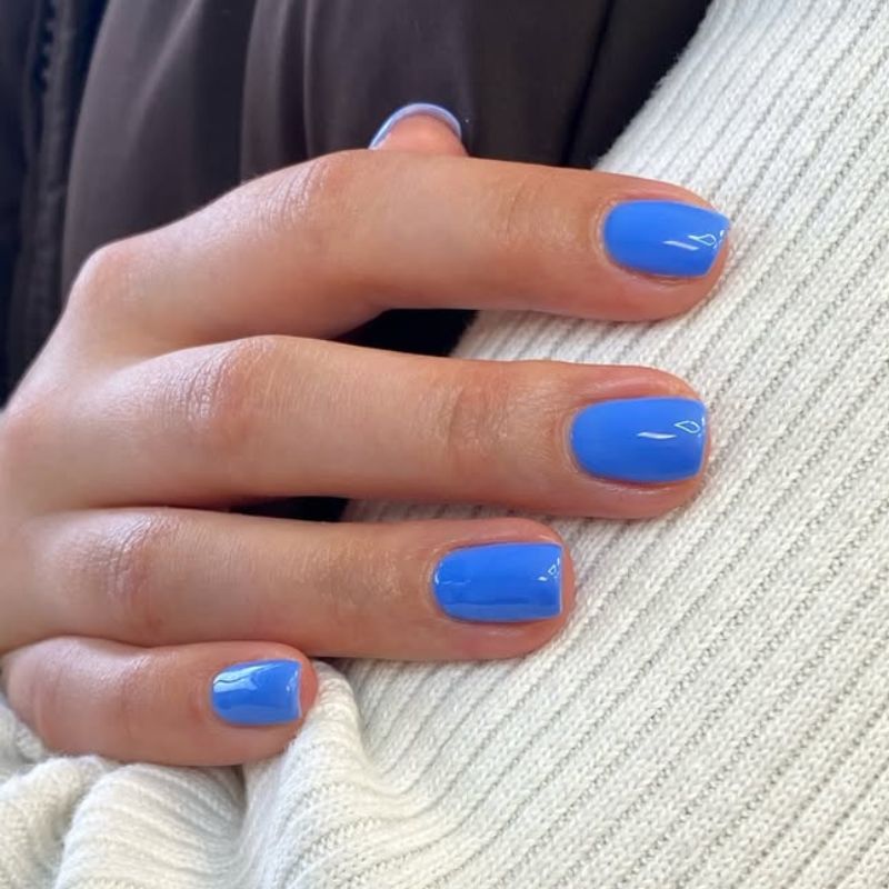A solid cobalt-blue gel polish with a super glossy top coat that reflects light like fresh spring skies. The square shape gives it a clean, modern edge, and the smooth, single-tone finish keeps it striking without extra art.