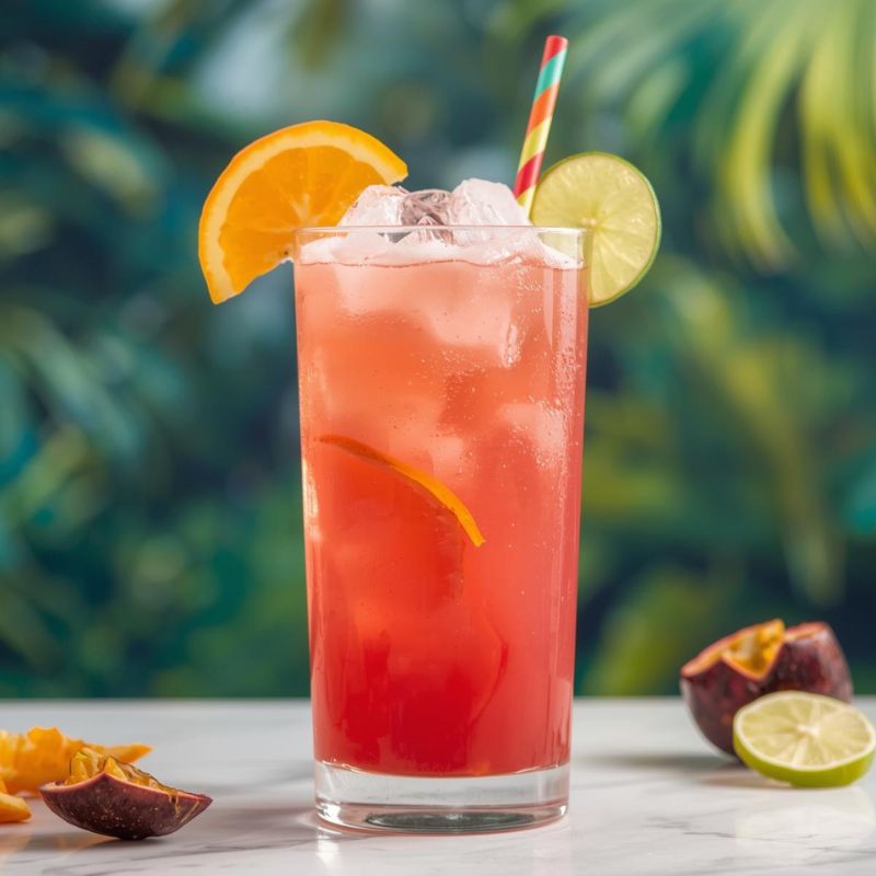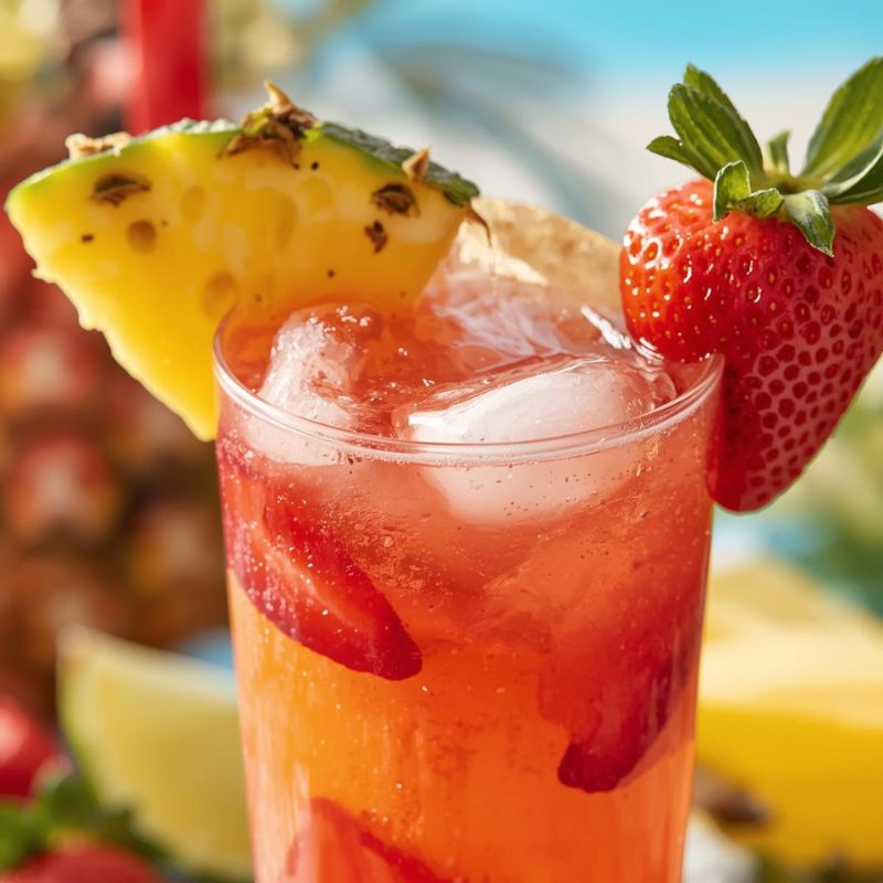 Preparation: Pour pineapple and orange juice over ice, then slowly add strawberry puree for a layered look.