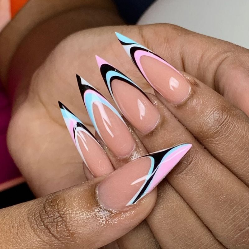 Nude base with pink, blue, and black abstract swirls. Modern, artistic, and eye-catching.