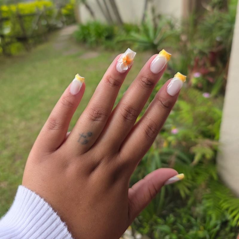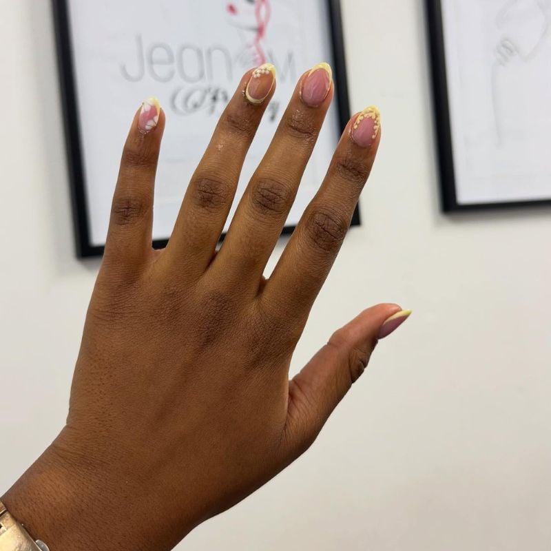 A creamy nude base with soft yellow tips and a floral accent. Light, cheerful, and beautifully balanced.